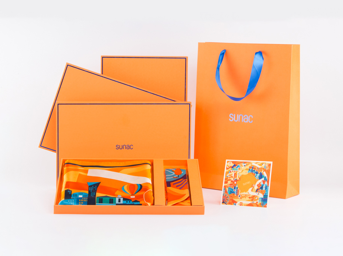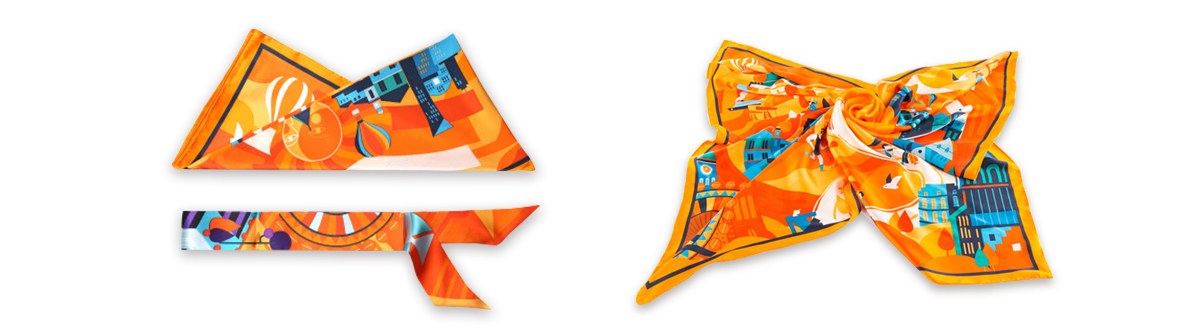商业定制,根据企业需求量身定制礼品 2019融创城市丝巾撷取十城芳华,融汇山魂海魄,以品牌色-----橙色为主色调,以圆满融合的圆形为构图,方寸间展现幸福生活,体现“城意相融·美好与共”的品牌理念。 方巾与窄巾组合套装,礼盒包装、内涵卡片,打造高档礼品