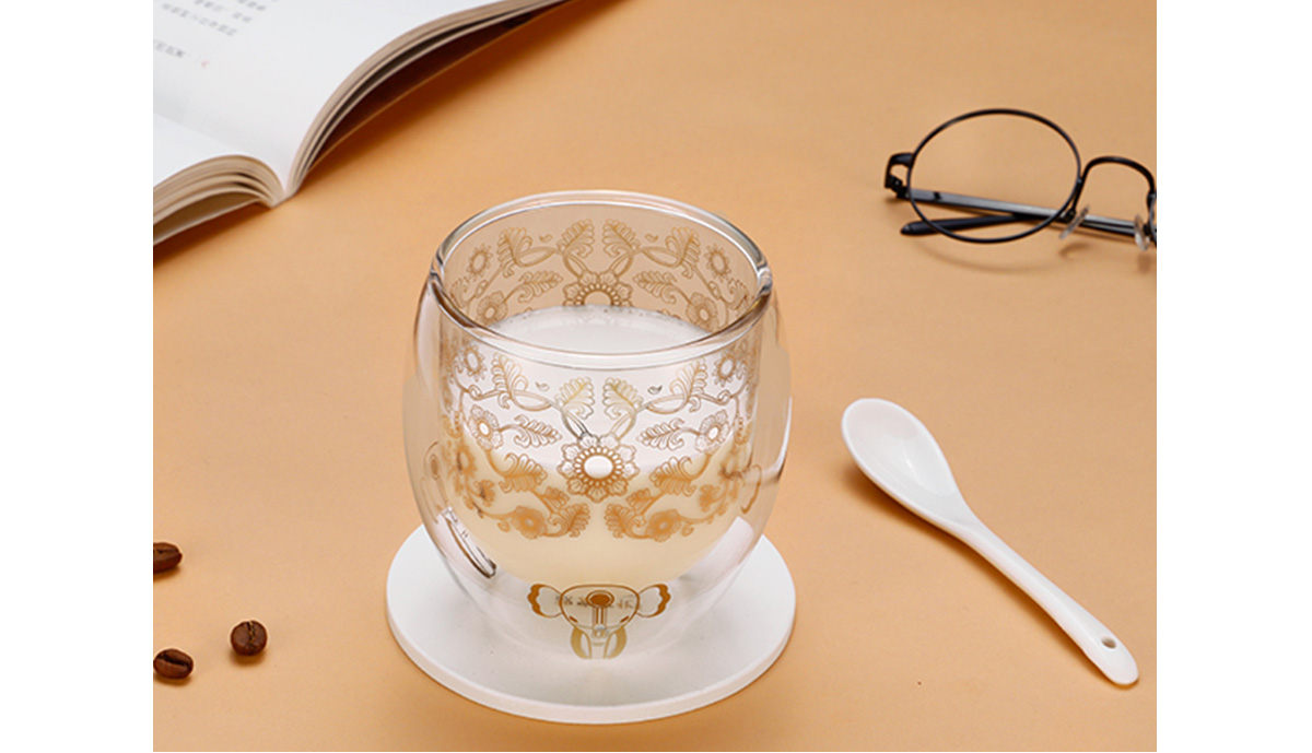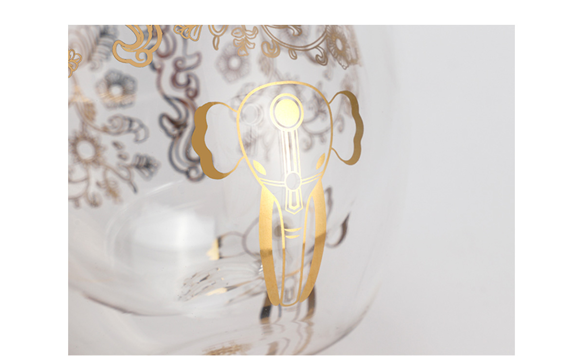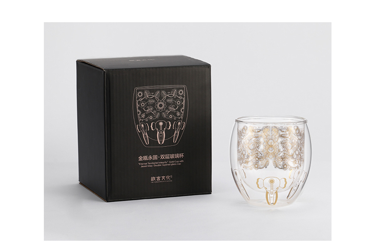 金瓯永固·双层玻璃杯 本产品设计以金瓯永固杯上宝相花、大象、龙为创作元素,提取元素并图像化处理,使其产品保留文物特点的同时,更具现代简约的气息。